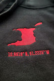 Notre carte classique de Trinité-et-Tobago avec sweat à capuche brodé de coordonnées. Coton de haute qualité avec une capuche confortable, des cordons de serrage assortis et une poche avant. Pour les articles correspondants pour compléter le look, cliquez ici .